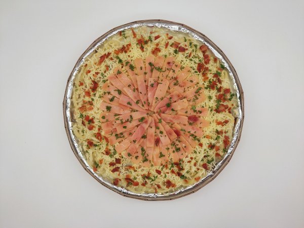 NEW Amber Creamy Carbonara! Creamy white sauce pasta with ham bits and button mushrooms. May ham strips, bacon, cheese, and parsley toppings. [Good for 11-15 pax]