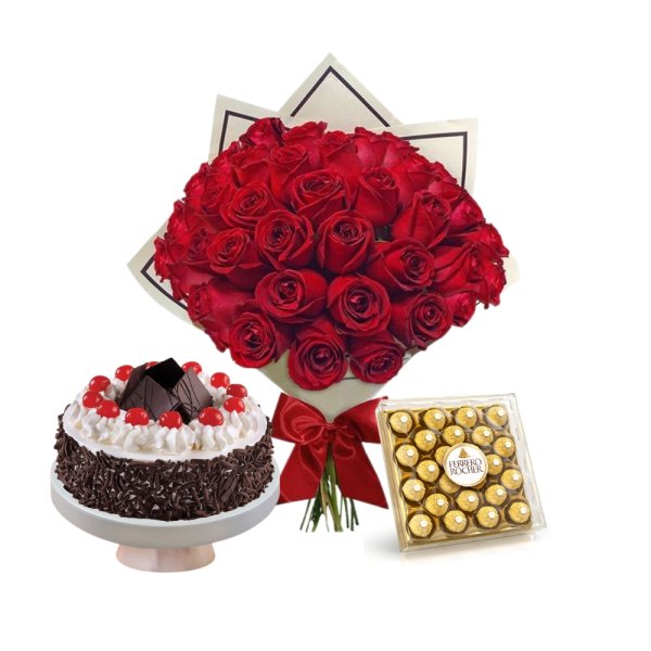 Luxurious Red Roses and Sweet Delights Gift Set Combo Gifts Luxurious Red Roses and Sweet Delights Gift Set 50 Red Roses Bouquet with Black Forest Royale Cake and 24 Ferrero Rocher Luxury Gift Set. Celebrate love, admiration, or a special occasion with this stunning gift set that combines timeless beauty and indulgent flavors: 🌹 50 Red Roses Bouquet An extravagant arrangement of 50 velvety red roses, hand-picked for freshness and romance. Expertly wrapped in elegant paper with a satin ribbon, this bouquet symbolizes deep love and affection β€” perfect for making a bold statement. 🍰 Black Forest Royale Cake A rich and decadent Black Forest Royale Cake, layered with moist chocolate sponge, whipped cream, and cherry filling. Topped with dark chocolate shavings and cherries, this gourmet cake is a feast for both eyes and taste buds. 🍫 24 Ferrero Rocher Luxury Gift Set A box of 24 golden Ferrero Rocher chocolates, known for their crisp hazelnut exterior, creamy filling, and fine chocolate coating. Presented in a premium gift box, it’s the ultimate treat for chocolate lovers.
