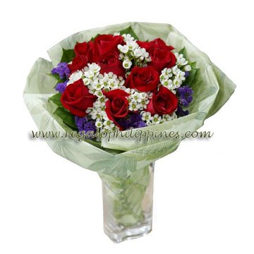 Resembling love now and forever, this hand bouquet of 12 red roses is sprinkled with white wax flowers and purple forget-me-nots.