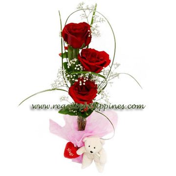 Three deep red roses spiral from a glass vase, with a small bear and ribbons and the foot of this miniature tower.