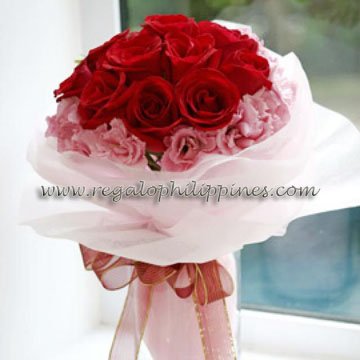 Suitable for brides or anyone else in love, this hand bouquet consists of twelve red roses and pink carnation, wrapped in a heavenly translucence.