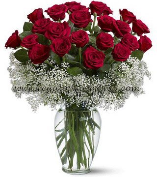 Twenty-four roses in a clear glass vase display your affection beautifully. Twenty-four roses and filler, delivered in a striking clear glass vase.