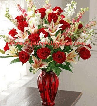 Red roses, Stargazer lilies beautifully designed by our select florists glass vase makes a stunning eyecandy.24 red rose and 2 stem of stargazer