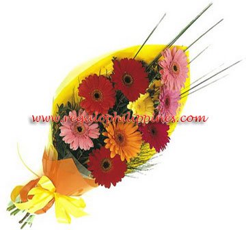 10 stems of red, yellow, pink and orange gerberas in bouquet.