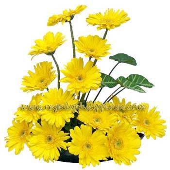 The lovely arrangement of 15 Yellow gerberas and greens in a flat base.
