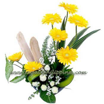 The ancient ikebana style looks in this arrangement with 7 Yellow bright Gerberas along with 6 White Roses greens and decors.