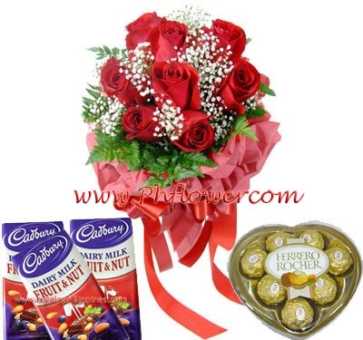 3 cadbury chocolate (75g each), 8 pcs ferrero rocher heart shape chocolate and 12 stems fresh red rose in bouquet.
