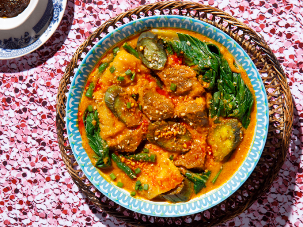 A classic Filipino stew with a thick peanut sauce made with beef chucks plus a mix of vegetables drizzled with annatto oil and garnished with chopped peanuts and spring onion. Served with sauteed Max's bagoong.