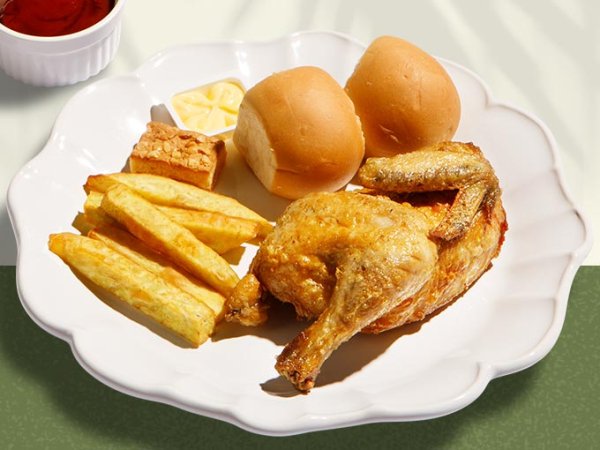 Half Spring Chicken, Choice of Kamote Fries or Kamote Chips, Choice of Rice, or Dinner Rolls & Butter, and a Caramel Bar.