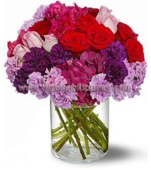 It's a beautiful bouquet to present to any signora or signorina. Red and purple carnations, dark pink hydrangea and hot pink freesia are delivered in a cylindrical clear glass vase.
